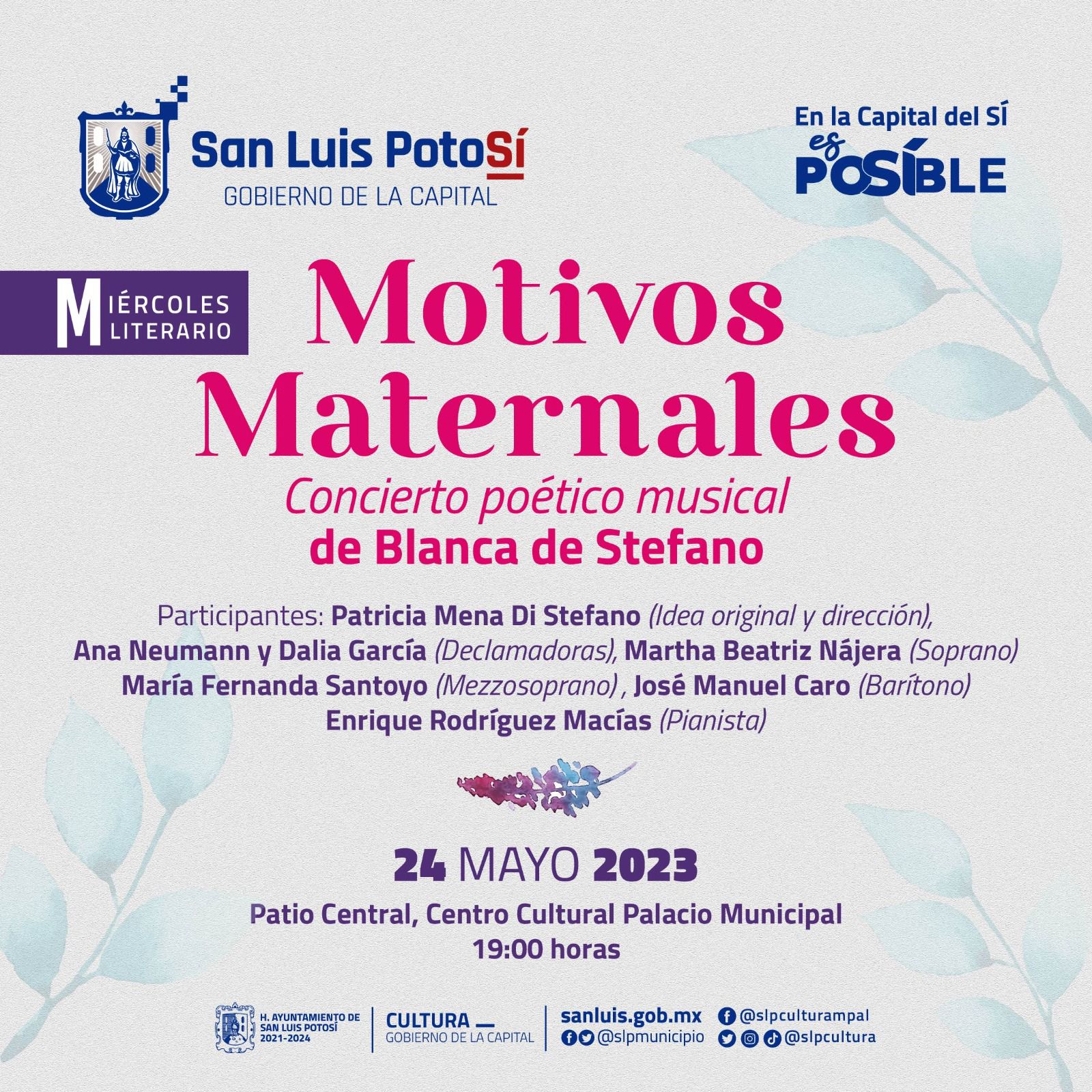 El H. Ayuntamiento de San Luis Potosí invita a los potosinos al recital poético musical “Motivos Maternales”, en el que participan grandes voces y está a cargo de la maestra Patricia Mena Di Stefano, quien produce y dirige el recital, original de su madre Blanca Di Stefano.