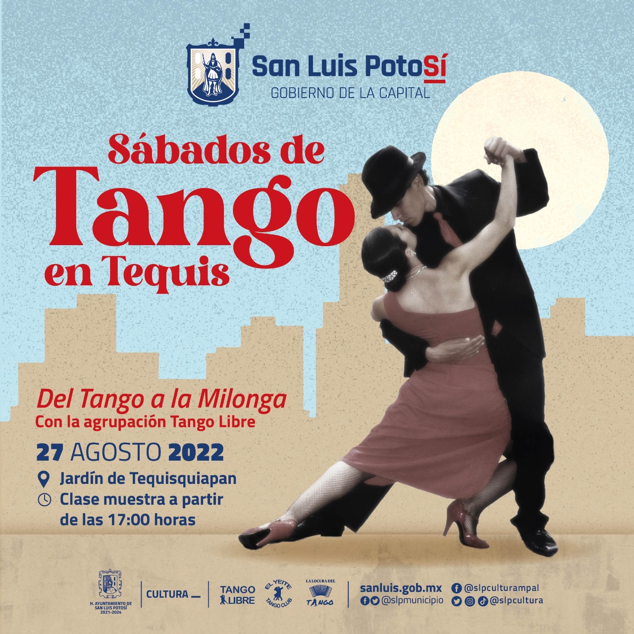 “Estamos contentos porque en coordinación con el Maestro Héctor Hernández de la Agrupación Tango Libre arrancaremos cada sábado en Tequis con el elegante y sensual baile que es el tango, sin duda, es un tipo de música y baile que es del gusto de muchos potosinos que ahora tendrán un espacio de exhibición y por qué no, de aprendizaje”, indicó el titular de Cultura Municipal.