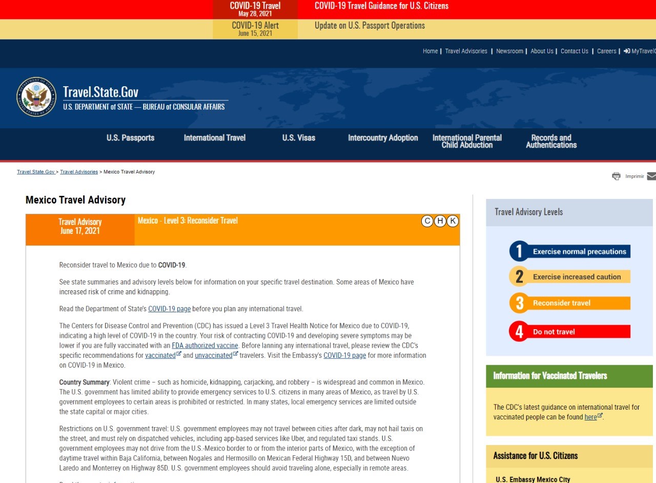 Cabe recordar que todos los destinos internacionales habían sido evaluados como Nivel 4 (rojo) al comienzo de la pandemia en marzo 2020 debido a la contingencia sanitaria Covid-19, pero el Departamento de Estado ha ido levantando esa advertencia.