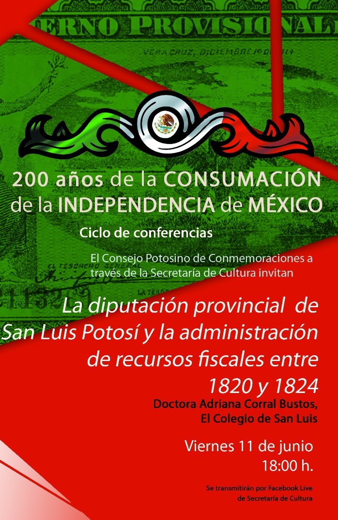 En esta ocasión, se presenta “La diputación provincial de San Luis Potosí y la administración de recursos fiscales entre 1820 y 1824”, que se llevará a cabo el viernes 11 de junio, a las 18:00 horas mediante Facebook Live, impartida por la Dra. Adriana Corral Bustos del Colegio de San Luis.