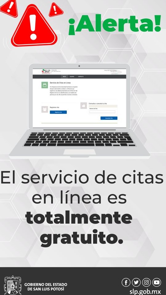 Los trámites presenciales se realizarán exclusivamente a las personas que previamente tramiten una cita por medio de la página http://citasrcslp.ddns.net; este sistema se implementó en cumplimiento a las disposiciones de las autoridades sanitarias para una reapertura escalonada, segura y con aforo limitado en espacios públicos.