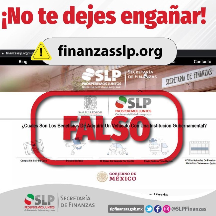 A través de la página www.finanzasslp.org, defraudadores promocionan subastas de autos, camionetas, tractocamiones, maquinaria pesada y aeronaves, así como la venta de cubrebocas. Dicho portal utiliza indebidamente, el logotipo de la Secretaría de Finanzas, así como la imagen institucional y diseño de las páginas de Gobierno del Estado.