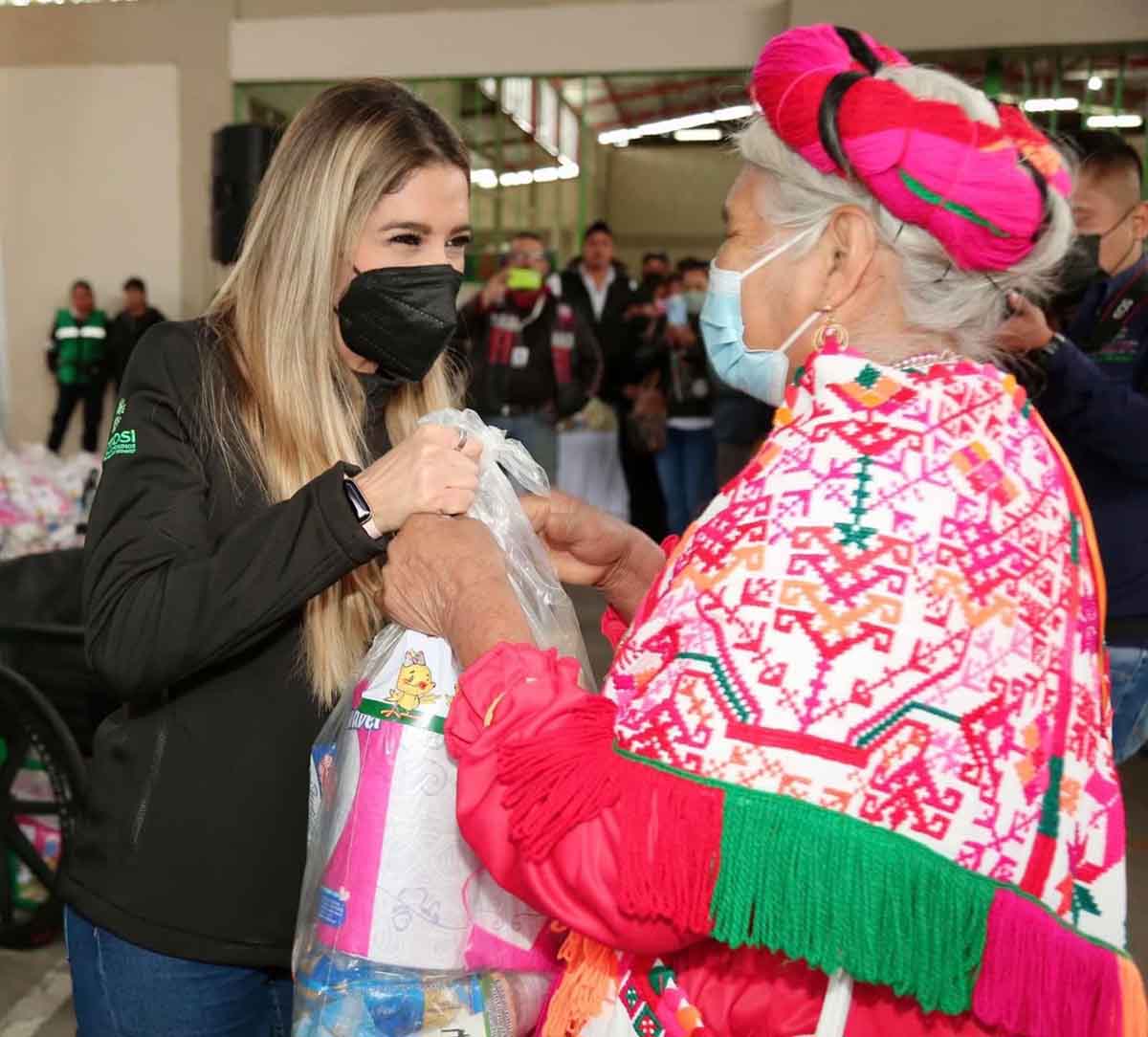 Las y los habitantes de Tampamolón Corona y de Tancanhuitz recibieron de manos de la presidenta estatal del DIF, Ruth González Silva, apoyos que representan un impulso para cubrir sus necesidades más apremiantes, por medio de insumos alimentarios con productos de la canasta básica y ayudas funcionales a favor de personas con discapacidad.