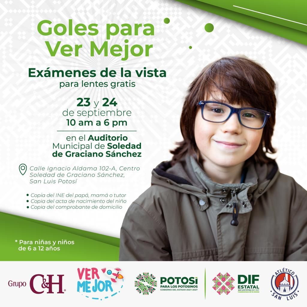 En apego a los lineamientos del Plan Estatal de Desarrollo 2021-2027, y a fin de brindar atención al eje de Bienestar para San Luis Potosí, como lo ha definido el Gobernador Ricardo Gallardo Cardona, el Sistema Estatal para el Desarrollo Integral de la Familia (DIF) convoca a la ciudadanía a formar parte de la campaña “Goles para Ver Mejor”, que beneficiará la salud visual de niñas y niños de Soledad de Graciano Sánchez.