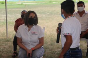 En San Vicente Tancuayalab, acompañada del Alcalde, Jesús Josué Soni Cortes; Flor María Meraz González, Presidenta del DIF; así como Presidentas de los Sistemas Municipales de la región, también entregó bicicletas a estudiantes de comunidades.