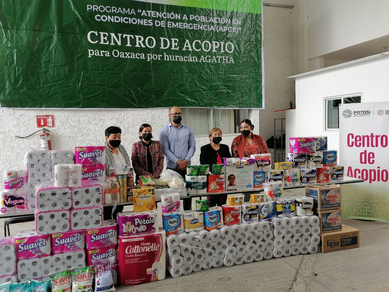 En un acto de solidaridad con el pueblo de Oaxaca, luego de los daños y afectaciones que a la población provocó el huracán Agatha, el Sistema Estatal para el Desarrollo Integral de la Familia (DIF) de San Luis Potosí instaló un centro de acopio para recolectar artículos de primera necesidad y limpieza para enviarlos a las personas en condición vulnerable de esta Entidad.