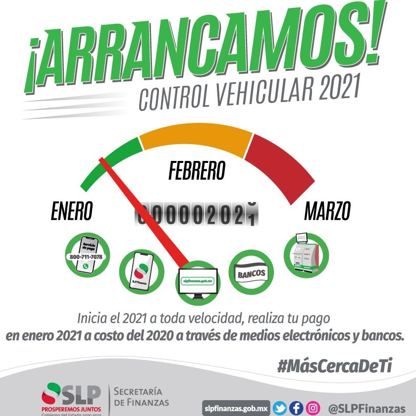 El pago de control vehicular se podrá realizar de enero hasta marzo sin multas ni recargos. De manera sencilla, pueden realizar su pago a través de la aplicación móvil “SLP Finanzas”, el sitio web slpfinanzas.gob.mx, 16 Centros Electrónicos ubicados en plazas comerciales, oficinas y presidencias municipales, así como en la línea telefónica 800 711 7078 y sucursales bancarias.