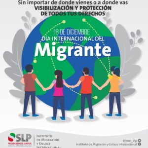 En el marco de la conmemoración del Día Internacional del Migrante, el Instituto de Migración y Enlace Internacional (IMEI), realizó un Conversatorio en línea sobre las proyecciones del fenómeno migratorio en San Luis Potosí rumbo al 2021, reafirmando el compromiso del Gobierno Estatal para la protección de los derechos tanto de las y los migrantes en tránsito por la entidad, así como los de nuestros connacionales en situación de movilidad.
