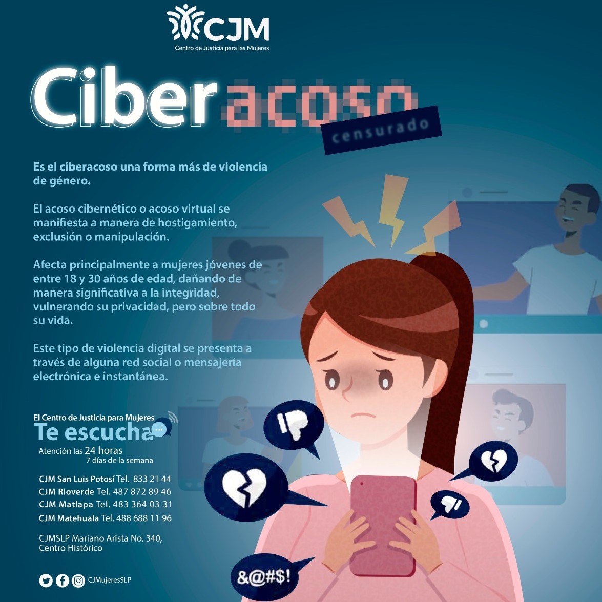Para brindar atención y capacitación sobre casos de Ciberacoso, los CJM reiteran sus líneas de atención en donde se encuentran expertas legales y de asesoría psicológica: en San Luis Potosí es el 444 833 21 44; 487 872 89 46 en Rioverde; 483 364 03 31 en Matlapa y 488 688 11 96 en Matehuala.
