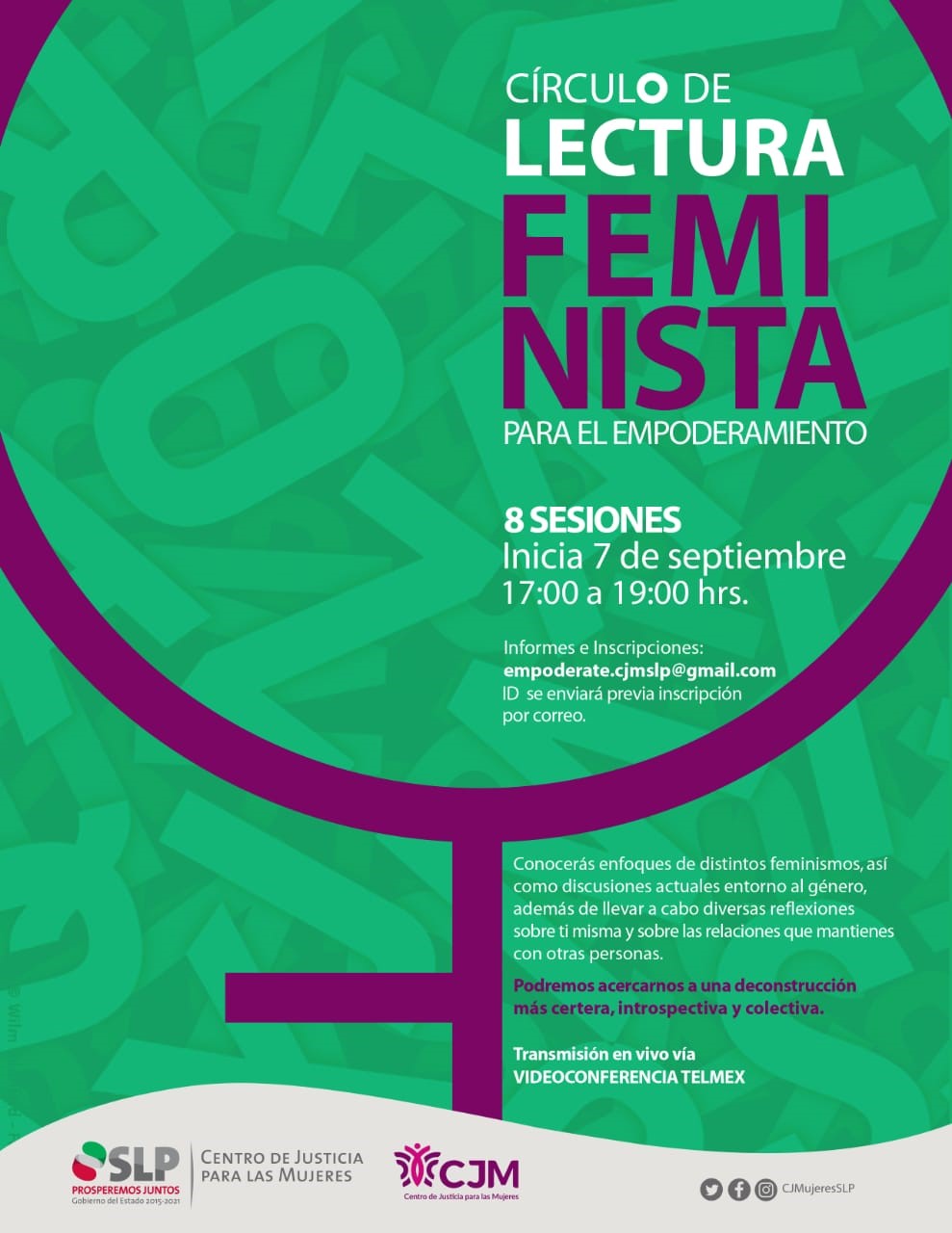 La directora general del CJM, explicó que a partir del lunes 07 de septiembre a las cinco de la tarde iniciarán estos círculos de lectura a través de una videoconferencia, donde se reflexionará sobre temas como perspectiva de género, historia y género, sistema sexo-género, corporalidad, decolonialidad, interseccionalidad, heterosexualidad y lesbianismo.