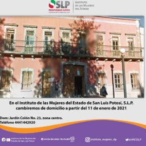 Con el objetivo de fortalecer la atención a las mujeres potosinas y ampliar la capacidad en sus instalaciones, del cuatro al ocho de enero personal del Instituto de las Mujeres del Estado (IMES) se mudará a la “Casa de las Artesanías” ubicada en la calle Jardín Colón número 23, en el Centro Histórico de la Ciudad, informó Erika Velázquez Gutiérrez, titular de la dependencia.