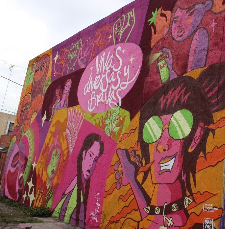 La titular del IMES detalló que el muro con la frase “Vivas, diversas y bravas” fue dirigido por la artista urbana y diseñadora gráfica Janin Garcín en el que participaron cinco alumnas: Elsa Aranda, Jimena Corona, Melissa Gallegos, Antonieta García y Eréndira Zapata, y cada una plasmó su identidad, teatro, música y lazos familiares.