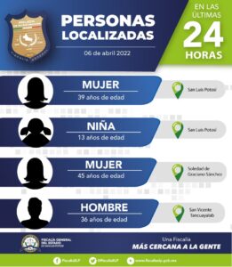 SLP. – La Fiscalía General del Estado (FGE) informó que fueron ubicados, y que ya se encuentran con sus familiares, tres mujeres y un hombre que eran buscados por las autoridades en San Luis Potosí.