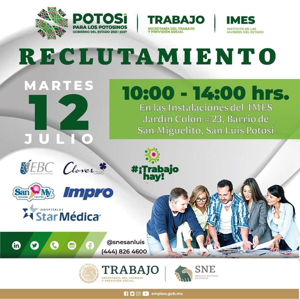 Este martes 12 de julio, el Instituto de las Mujeres (Imes) de San Luis Potosí realizará la primera “Jornada de Reclutamiento” para mujeres de la zona metropolitana, en coordinación con la Secretaría del Trabajo y Previsión Social (STPS) y el Sistema Nacional del Empleo (SNE), en donde se ofertarán oportunidades de empleo por parte de empresas instaladas en la Entidad.
