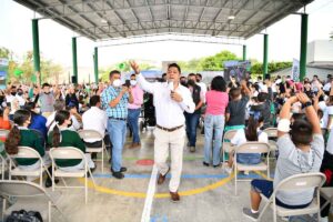 Frente a docenas de niñas, niños, jóvenes, docentes, madres y padres de familia, Ricardo Gallardo también se comprometió a iluminar con lámparas nuevas la cabecera municipal y a construir un bulevar hacia Villa Juárez, que tendrá un costo muy alto, porque sus habitantes se lo merecen, además de aportar recursos para que el ayuntamiento pavimente más calles.