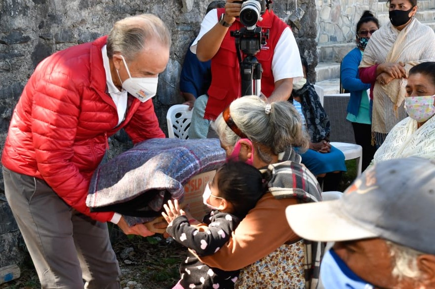 Zaragoza, S.L.P.- Derivado del programa de apoyo para personas en condiciones de emergencia, el Gobernador del Estado, Juan Manuel Carreras López y la Presidenta de la Junta Directiva del Sistema Estatal DIF, Lorena Valle Rodríguez, iniciaron la entrega de cobijas y despensas a decenas de familias de la localidad de Kilómetro 58, ubicado en Sierra de Álvarez, como parte de una estrategia integral para proteger a la población vulnerable ante las bajas temperaturas de la época invernal.