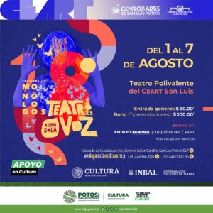 En San Luis sí hay apoyo a la cultura y a las diferentes expresiones artísticas, con el 18° Festival de Monólogos a «Teatro a una sola voz», que se realizará en la Entidad del 1 al 7 de agosto en el Teatro Polivalente del Centro de las Artes en el que se ofrecerá a visitantes locales, nacionales y extranjeros siete obras escritas, producidas, dirigidas e interpretadas por talento mexicano.