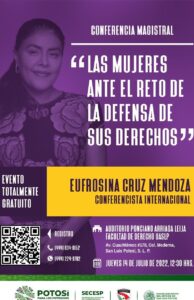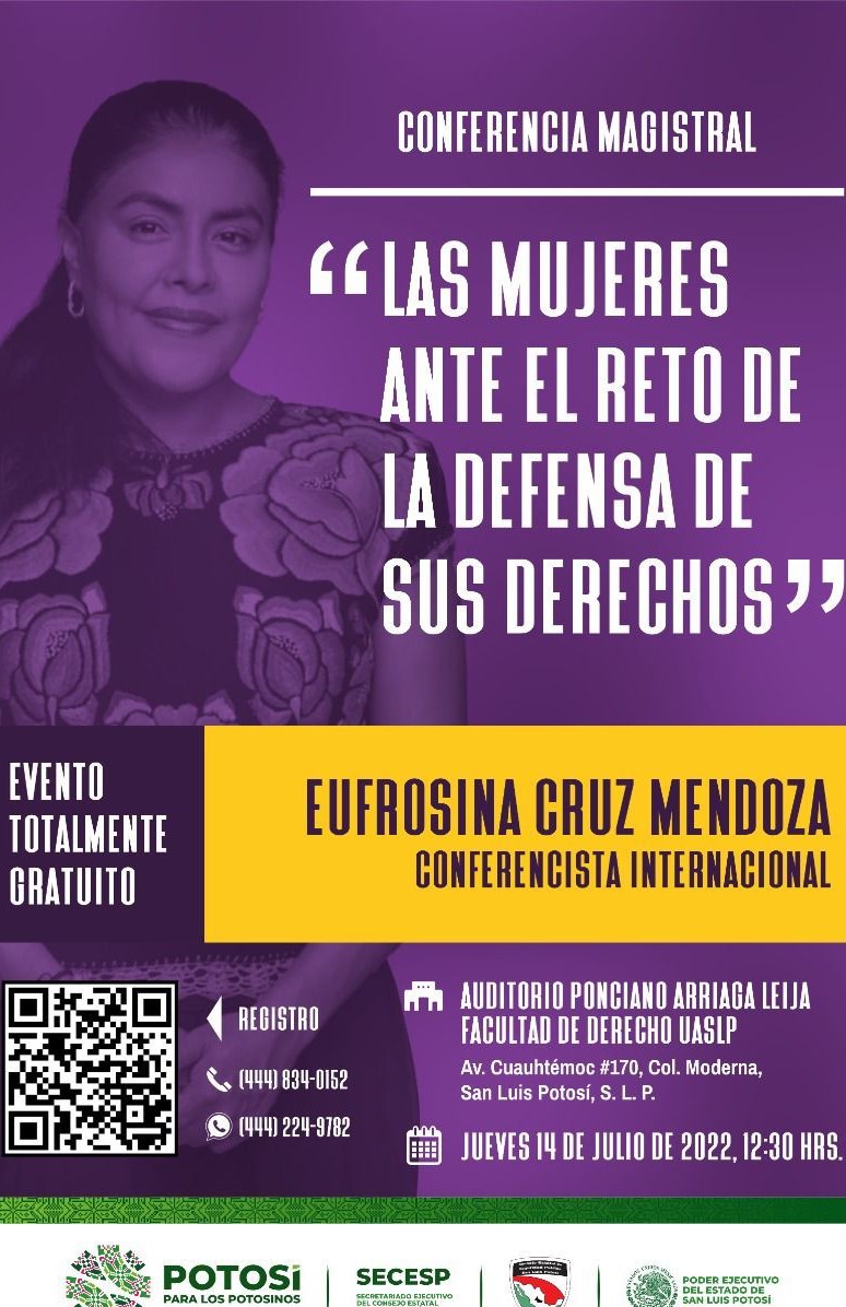 Como parte de la estrategia del Gobernador Ricardo Gallardo Cardona para promover la igualdad, el liderazgo y el empoderamiento de las mujeres de las cuatro zonas del Estado, el Secretariado Ejecutivo del Consejo Estatal de Seguridad Pública (SECESP) ofrecerá este jueves 14 de julio a las 12:30 horas, la conferencia magistral “Las mujeres ante el reto de la defensa de sus derechos”, impartida por la diputada federal Eufrosina Cruz Mendoza, en el Auditorio «Ponciano Arriaga Leija» de la Facultad de Derecho de la Universidad Autónoma de San Luis Potosí.