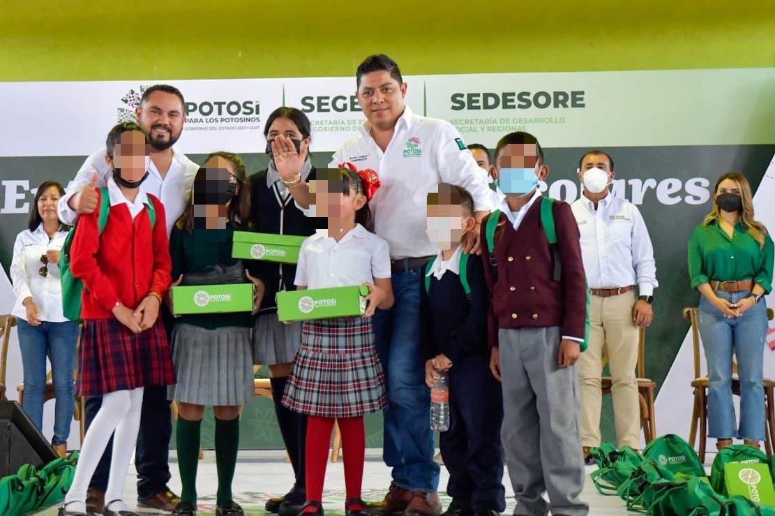 El Gobernador Ricardo Gallardo entregó apoyos escolares y anunció el inicio del programa de iluminación de Moctezuma con lámparas LED.
