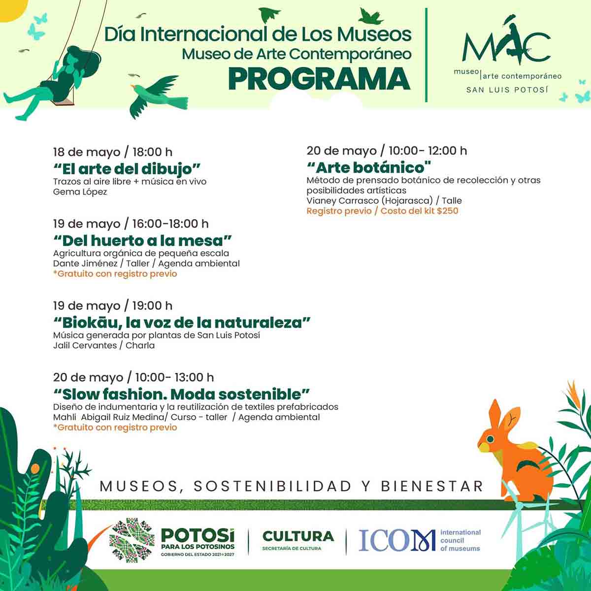 En el marco del Día Internacional de los Museos, la Secretaría de Cultura del Gobierno Estatal (Secult), tiene preparado un amplio programa de actividades que se llevarán a cabo del 18 al 21 de mayo en todos los recintos culturales potosinos, con más de 110 actividades que contarán con entrada libre para las familias potosinas y visitantes de estados vecinos y extranjeros.