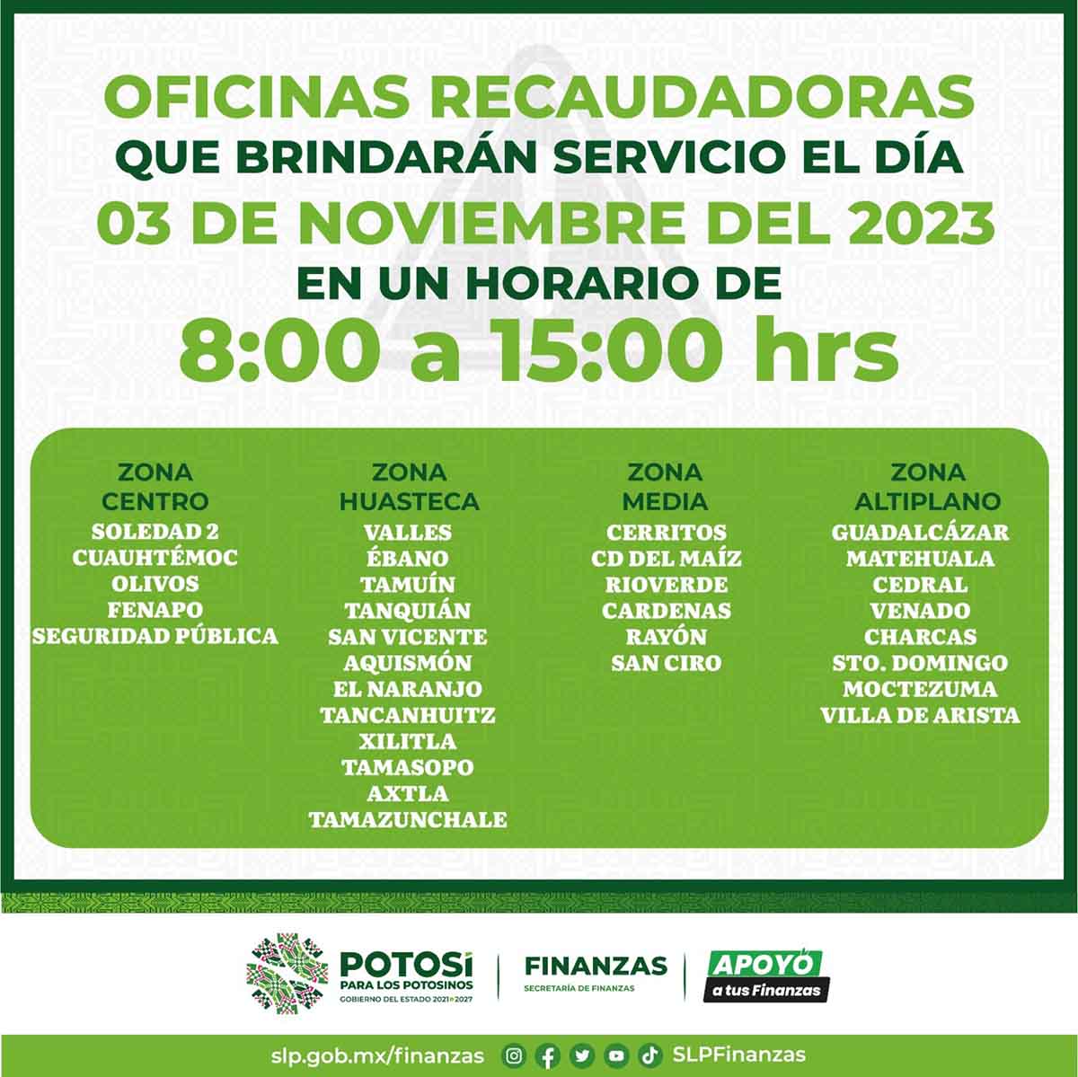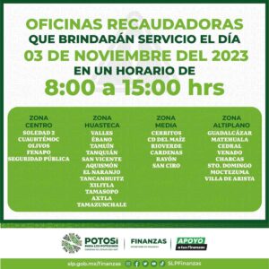 En apoyo a las y los potosinos, quienes en los próximos días descansarán con motivo del puente de día de muertos, para que puedan realizar sus trámites de control vehicular, licencias y placas gratuitas, la Secretaría de Finanzas (Sefin), brindará servicio en 36 oficinas recaudadoras de todo el Estado, del primero al 3 de noviembre, en un horario de 8:00 a 15:00 horas, con personal de confianza.