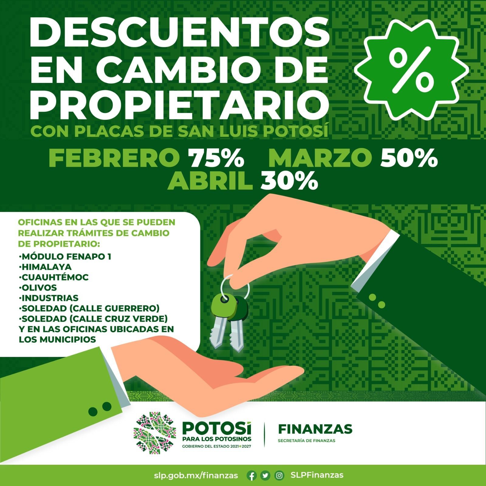 En una acción más para favorecer la economía de la ciudadanía potosina y brindar certeza legal a quien adquirió una unidad vehicular con placas de San Luis Potosí, y todavía no se encuentra a su nombre, de acuerdo con lo instruido por el Gobernador del Estado, Ricardo Gallardo Cardona, la Secretaría de Finanzas arrancó una campaña de descuentos en el trámite de cambio de propietario.