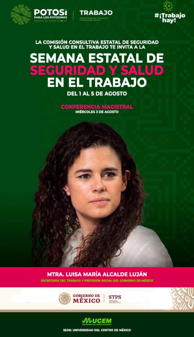 María Luisa Alcalde Luján, titular de la Secretaría del Trabajo y Previsión Social del Gobierno de México, sostendrá un encuentro con el Gobernador de San Luis Potosí, Ricardo Gallardo Cardona en la capital potosina, en el marco de las actividades de la Semana Estatal de Seguridad y Salud en el Trabajo, que organiza la STPS estatal y la Comisión Consultiva Estatal de Seguridad y Salud en el Trabajo (Cocoesst).