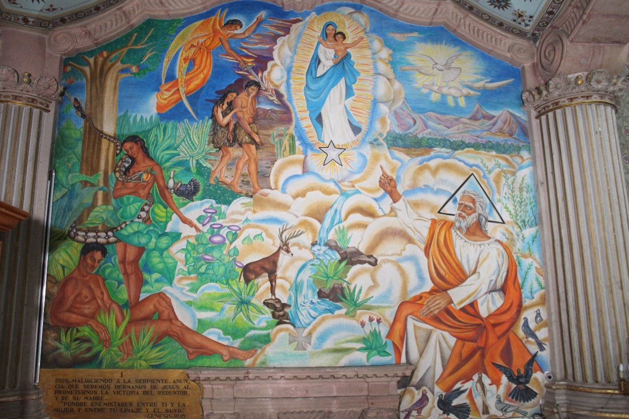 El mural que se localiza al lado izquierdo de la nave, corresponde a la «Promesa del Redentor» y el de lado derecho a la «Inmaculada Concepción»
