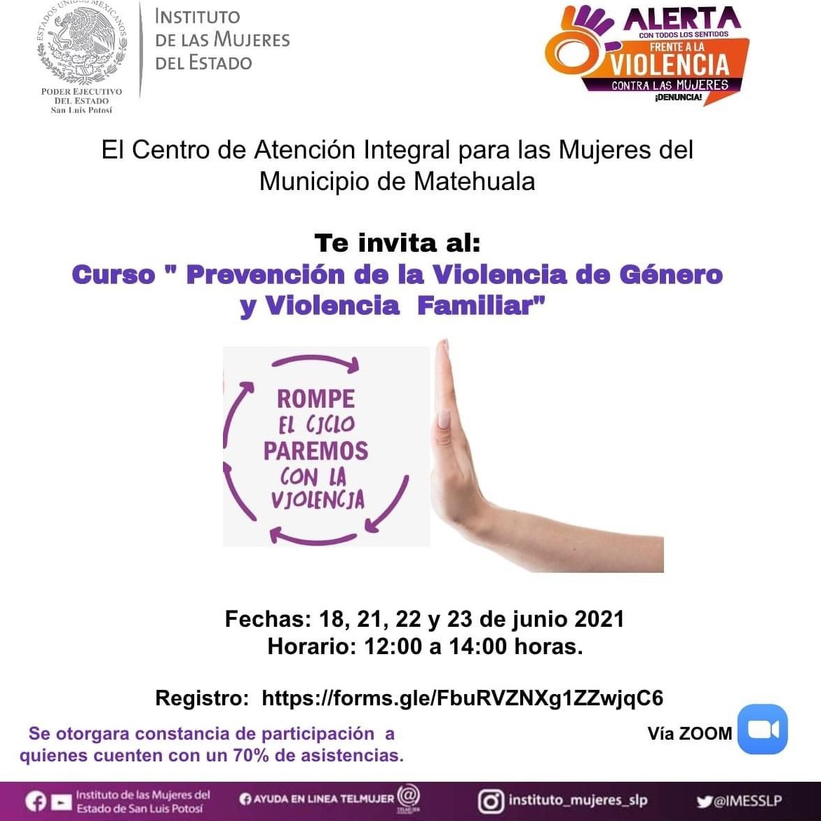 El Instituto de las Mujeres del Estado (IMES), a través de su Centro de Atención Integral en el municipio de Matehuala, invita al público al curso en línea “Prevención de la violencia de género y familiar” que se llevará a cabo los días 18, 21, 22 y 23 de junio.