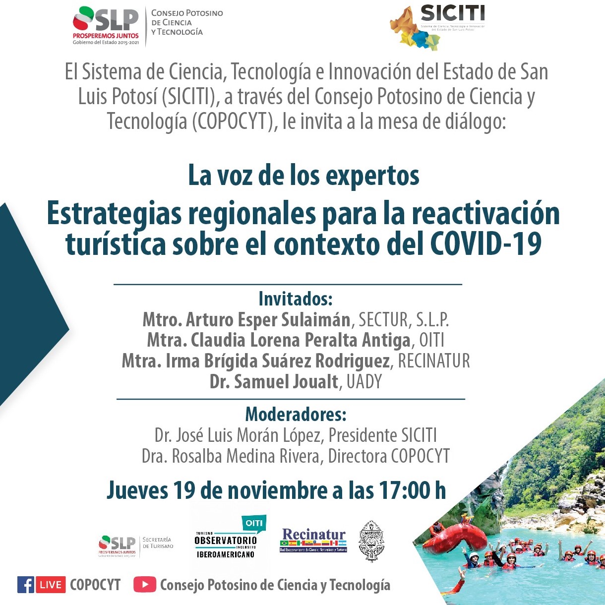 El Consejo Potosino de Ciencia y Tecnología (COPOCYT) y el Sistema de Ciencia, Tecnología e Innovación (SICITI), invitan a participar en la mesa de diálogo “La voz de los expertos: Estrategias regionales para la reactivación turística sobre el contexto del COVID19″, que se llevará a cabo este jueves 19 de noviembre de 2020 a las 17:00 horas, informó la directora general, Rosalba Medina Rivera.