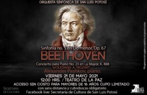 En este primer concierto de entrada libre, cupo limitado, con uso obligatorio de cubrebocas y respetando la sana distancia, la OSSLP interpretará la Quinta Sinfonía, de Beethoven, dedicada al príncipe Lobkowitz y al conde Andrei Razumovsky, la Quinta Sinfonía se estrenó el jueves 22 de diciembre de 1808 en el Theateran der Wien, en un concierto maratónico de cuatro horas de duración que incluyó exclusivamente obras del compositor alemán y que, además fue el último concierto en que Beethoven tocó en público.