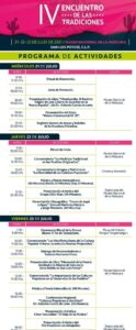 Para más información de la Cuarta Edición del Encuentro Internacional de las Tradiciones, se les invita a consultar las redes sociales oficiales de la Secretaría de Cultura de San Luis Potosí.