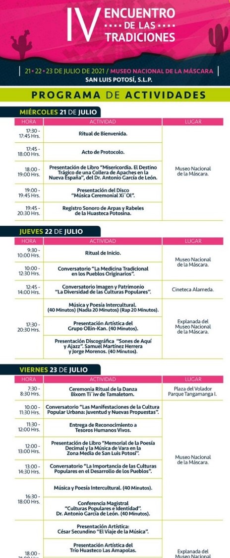 Como parte del Programa de Acciones Culturales Multilingües y Comunitarias (PACMYC), la Secretaría de Cultura (SECULT) invita a participar en el IV Encuentro de las Tradiciones, ha realizarse del 21 al 23 de julio de 2021 en diversos recintos culturales y recreativos de la capital potosina.