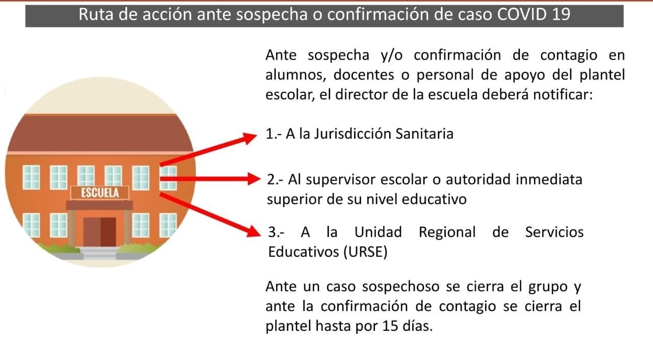 Recordó que la Ruta de acción ante sospecha o confirmación de un caso COVID 19, es la siguiente: “ante sospecha y/o confirmación de contagio en alumnos, docentes o personal de apoyo del plantel escolar, el director de la escuela deberá notificar primero a la Jurisdicción Sanitaria, además al supervisor escolar o autoridad inmediata superior de su nivel educativo y, de ser el caso, a la Unidad Regional de Servicios Educativos (URSE); además, ante un caso sospechoso se cierra el grupo y ante la confirmación de contagio, se cierra el plantel hasta por 15 días”, finalizó.