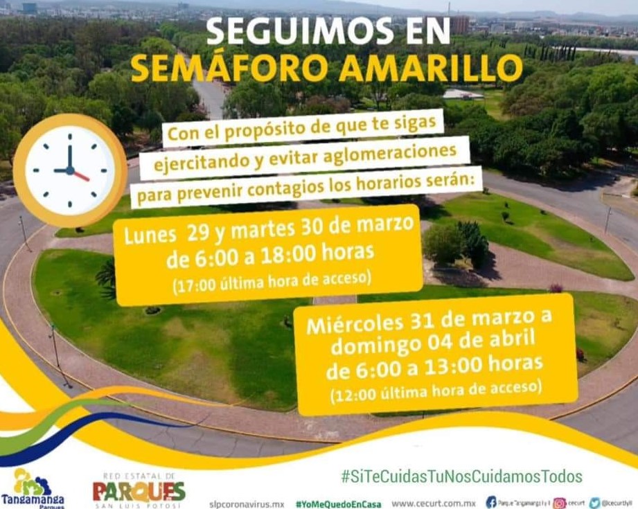 Con el propósito de reducir aforos para evitar riesgos a la salud por la pandemia de Covid-19, los Parques Tangamanga, Los Azahares en Rioverde y el Tantocob en Ciudad Valles, tendrán un horario 6:00 a 13:00 horas del miércoles 31 de marzo al 11 de abril con último acceso a las 12:00 horas.