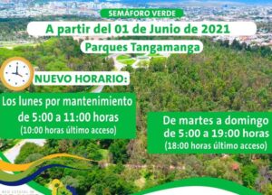 Con motivo de la permanencia de San Luis Potosí en color verde de acuerdo con el Semáforo Epidemiológico nacional, la Red Estatal de Parques dio a conocer que a partir del 1 de junio del presente año, se amplían los horarios de sus intalaciones, de martes a domingo de 5:00 a 19:00 horas con último acceso a las 18:00 horas, y los lunes de 5:00 a 11:00 horas con último acceso a las 10:00 por labores de mantenimiento.