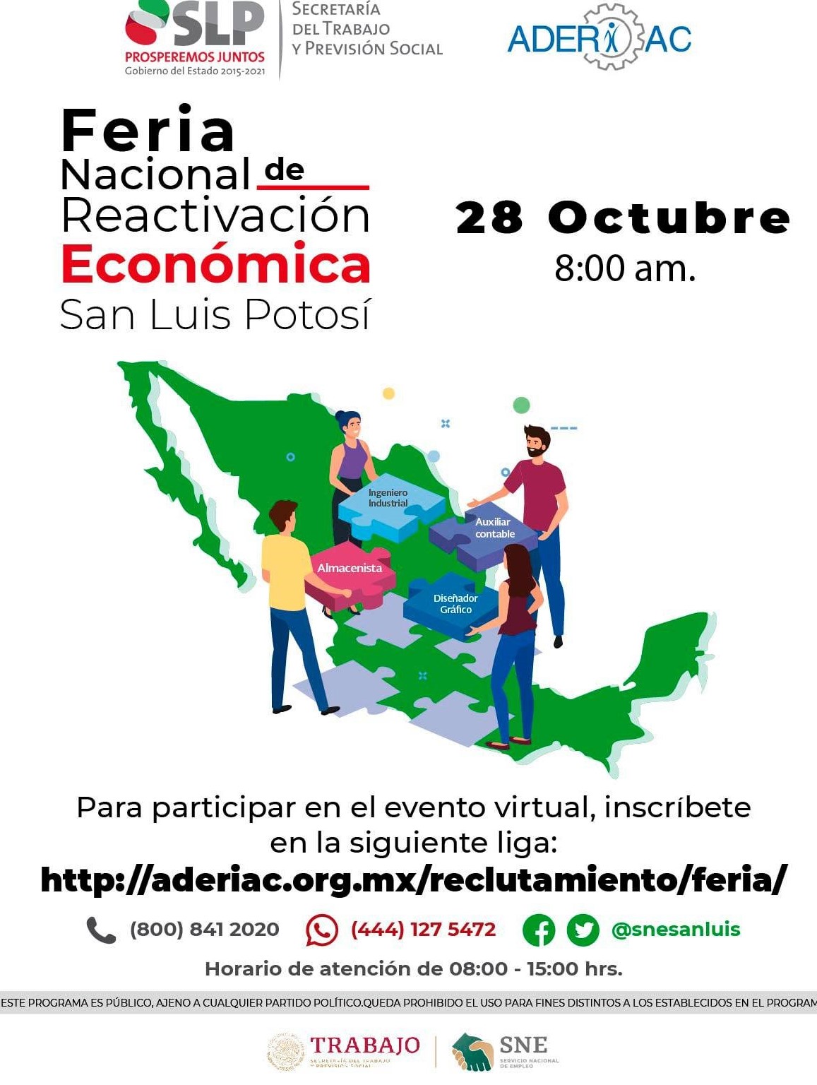 El funcionario estatal detalló que este evento se ejecutará de manera virtual con apoyo del Servicio Nacional de Empleo (SNE) y en coordinación con la Asociación de Ejecutivos de la Gestión del Talento Humano de San Luis Potosí, AC (ADERIAC), en cumplimiento a las Disposiciones de las autoridades sanitarias para el cuidado de la salud de la población por el Covid-19.