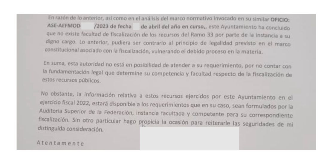 En un oficio enviado a los alcaldes por el delegado estatal de la Secretaría del Bienestar, Gabino Morales Mendoza, reafirmó que la ASF es la única autoridad que cuenta con facultades para fiscalizar directamente los recursos de origen federal que ejercen las entidades del país, los municipios y alcaldías de la Ciudad de México, toda vez que la Constitución Política de los Estados Unidos Mexicanos, la Ley de Fiscalización y Rendición de Cuentas de la Federación y diversas leyes específicas, le otorgan facultad expresamente, coligiéndose que dicha fiscalización es exclusiva de la autoridad nacional y no del órgano estatal auditor.