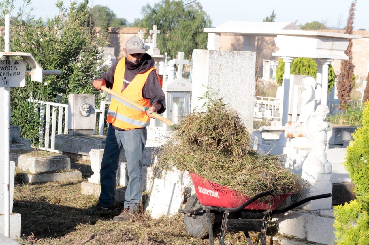 SLP.- Previo a la celebración por el Día de Muertos, continúan los trabajos de limpieza, mantenimiento y embellecimiento de los panteones municipales, informó el director de Servicios Municipales, Christian Iván Azuara Azuara quien señaló, actualmente se llevan a cabo acciones de recolección de basura y maleza, deshierbe y mantenimiento general para mejorar la imagen de los cementerios como parte de los preparativos para las festividades.