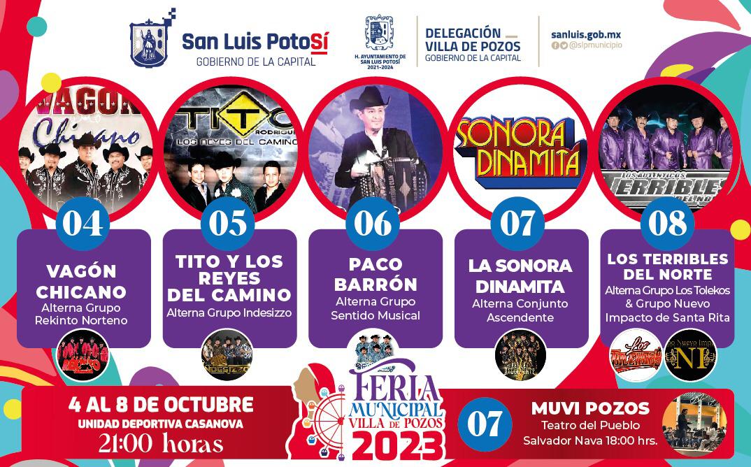 Los eventos masivos en el Teatro del Pueblo y la unidad deportiva Casanova serán gratuitos y en la cartelera artística se contará en la inauguración el miércoles 4 de octubre, con Vagón Chicano; 5 de octubre, Tito y los Reyes del Camino; 6, Paco Barrón y sus Norteños Clan; 7, Sonora Dinamita; y el 8, Los Auténticos Terribles del Norte, quienes alternarán con grupos locales de Villa de Pozos.
