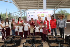 SLP.- En una de las comunidades más alejadas de la Capital Potosina, Terrones Sangre de Cristo, ubicada en la delegación de Bocas, se instaló el huerto número 15 del programa “Cosechando para tu mesa” en la Escuela Primaria Municipal «Josefa Ortiz de Domínguez», donde participan madres y padres de familia, así como el alumnado y docentes.