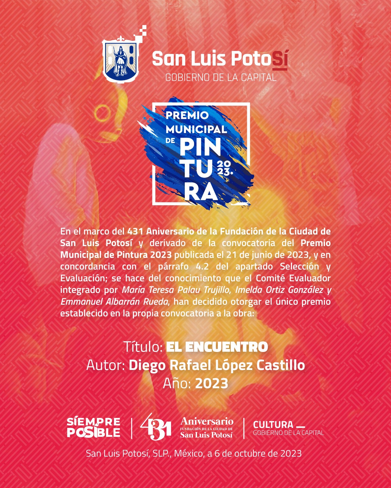 Gran respuesta tuvo la convocatoria al Premio Municipal de Pintura 2023, realizada por el Honorable Ayuntamiento de San Luis Potosí a través de la Dirección de Cultura Municipal, en coordinación con la Comisión de Cultura, Recreación, Deporte y Juventud.