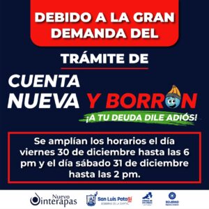 SLP.- Derivado de la gran aceptación que ha tenido el programa de regularización de adeudos «Cuenta Nueva y Borrón», el Nuevo Interapas amplío el horario de atención hasta las 18:00 horas este viernes 30 de diciembre.