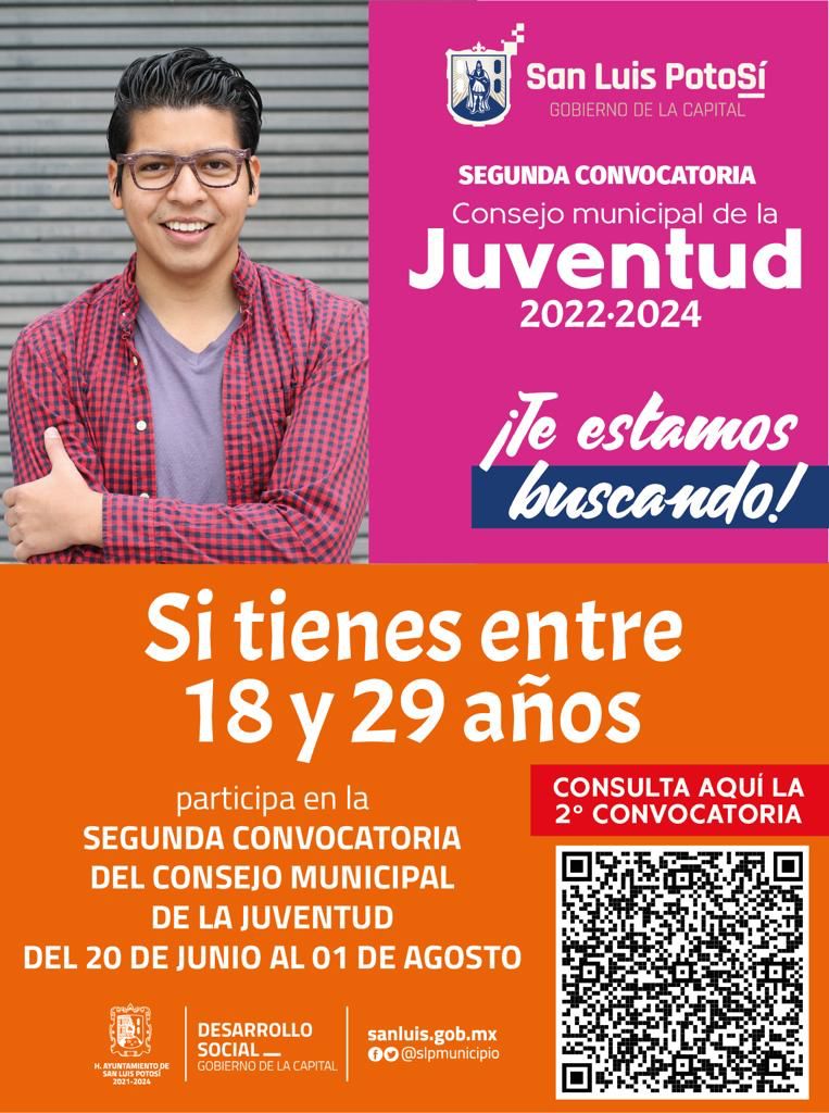 Se mantiene abierta la segunda convocatoria para la integración del Consejo Municipal de la Juventud 2022-2024, por lo que la Dirección de Desarrollo Social y la Subdirección de Atención a la Juventud, invitan a participar a todas y todos los jóvenes que residen en la Capital. La convocatoria y el formulario de inscripción se puede revisar en el sitio oficial del Ayuntamiento: https://sitio.sanluis.gob.mx/ConvocatoriaJuventud/