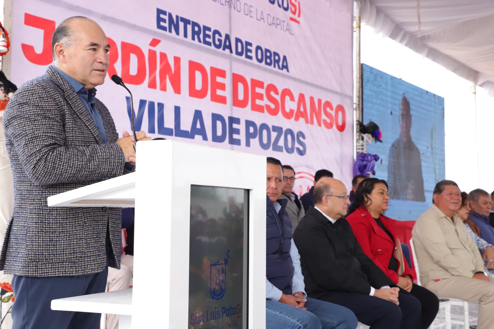 La mañana de este martes, el Alcalde de San Luis Capital, Enrique Galindo Ceballos, acompañado de su equipo de trabajo, entregó a la ciudadanía la anhelada construcción del Jardín de Descanso Eterno en Villa de Pozos, de más de 13 mil metros cuadrados, un sitio requerido por muchos años por pobladores de la demarcación ante la falta de espacios para el destino final de sus seres queridos: “Desde hoy es plenamente funcional este espacio, es el mejor del municipio de la Capital del estado. Hoy estamos cumpliendo con la tarea que ustedes me dieron cuando votaron por mí, soy el Alcalde que da este servicio municipal”, expresó el Presidente Municipal.