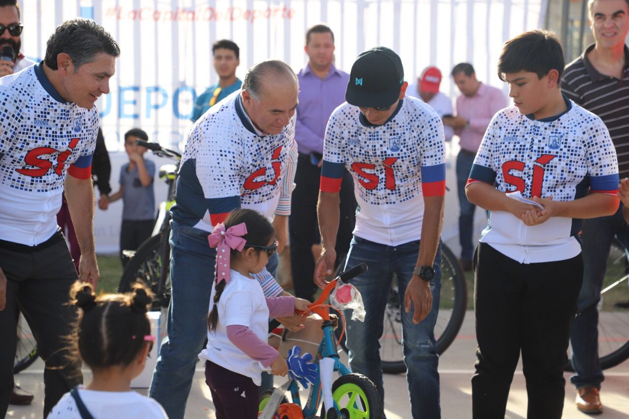 El ciclista internacional Nairo Quintana, el alcalde Enrique Galindo y el más importante pedalista mexicano de la historia, Raúl Alcalá; entregaron bicicletas de ruta y montaña a niñas, niños y jóvenes potosinos en el Centro Deportivo Los Vergeles al norte de la Capital. Los beneficiaron también recibieron jersey y casco, indumentaria con la que iniciará su camino dentro de la disciplina.
