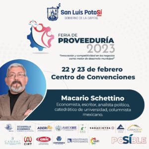 La Feria de la Proveeduría 2023 se desarrollará los días 22 y 23 de febrero en el Centro de Convenciones de San Luis Potosí. Contará con la presencia de la periodista financiera Maricarmen Cortés; el economista Macario Schettino; el académico Leo Zuckermann; el periodista especializado en negocios, Rodrigo Pacheco; el consultor Alejandro Kasuga; el presidente y fundador de El Gran Bajío, Federico Quinzaños; la emprendedora Nazareth Black y el fundador de startups Andrés de la O.