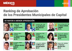 En el ranking de aprobación de presidentes municipales de capitales del país, el Alcalde de San Luis Potosí, Enrique Galindo Ceballos, se ubicó en el tercer lugar en el estudio nacional de opinión pública correspondiente al mes de abril, realizada por la organización México Elige, con un 62.4 por ciento de ciudadanos que tienen una opinión favorable de su administración.