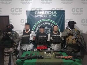Ciudad Valles, San Luis Potosí.- Como resultado del despliegue constante de trabajos de inteligencia en la región Huasteca, y dentro de las estrategias preventivas trazadas en el Plan Integral de Seguridad para combate frontal de la delincuencia, elementos de la Guardia Civil Estatal (GCE) detuvieron a tres presuntos integrantes de una célula criminal a quienes se les aseguraron tres armas largas, cargadores, cartuchos útiles, un vehículo con reporte de robo y equipo táctico.