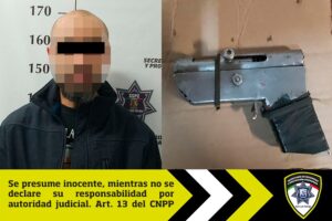 Finalmente, el sujeto fue canalizado al área de Justicia Cívica de la SSPC para una certificación médica y posteriormente presentado a la Fiscalía General del Estado para que se determine su presunta responsabilidad en el delito de portación de arma prohibida.